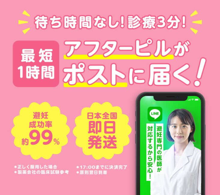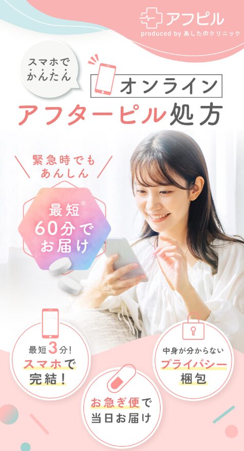 アフピルは、24時間予約でき、LINEとビデオ診療で完結する使いやすさが魅力。診察料無料で、最短1時間配送や匿名配送にも対応しており、急ぎでも人目を気にせず相談しやすいです。