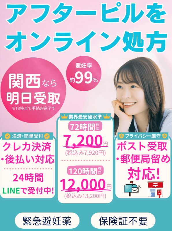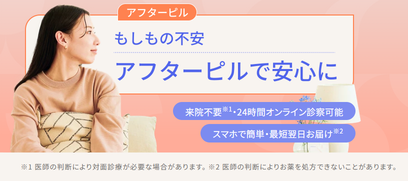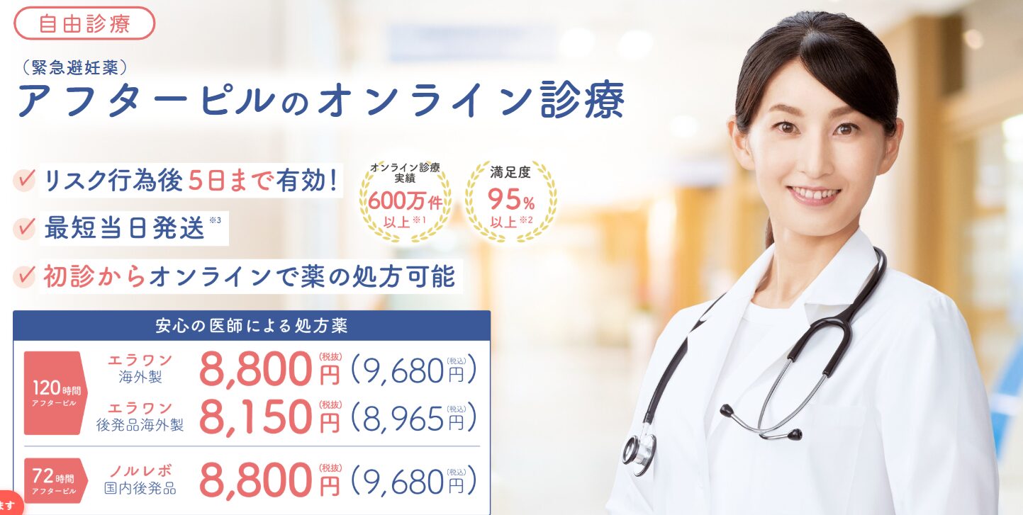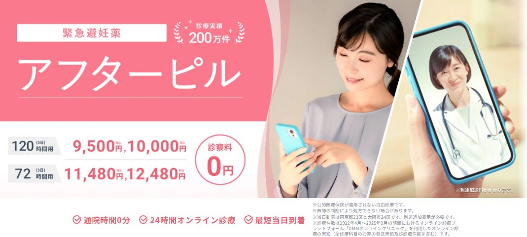 DMMオンラインクリニックは、24時間オンライン診療に対応し、診察料0円で受診しやすいのが魅力。アフターピルは72時間用・120時間用から選べ、最短当日到着にも対応しているため、急ぎの相談でも使いやすいです。