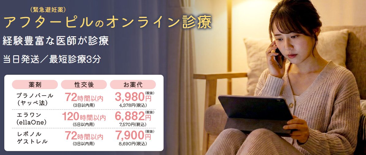 | オンライン クリニック | 72時間 アフターピル | 120時間 アフターピル | 診察料 + システム使用料 | 配送料 | 当日発送 の条件 | 公式サイト |
